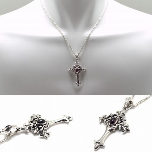 【シルバーネックレス】 ガーネット×クロス×フレア メンズ レディース ペア (PJ-400ga)